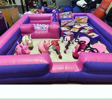 This package comes with a 12x15ft Bouncy Castle, 10x10ft Inflatable ball bit , shapes, hoppers, scuttle bug and ride on.