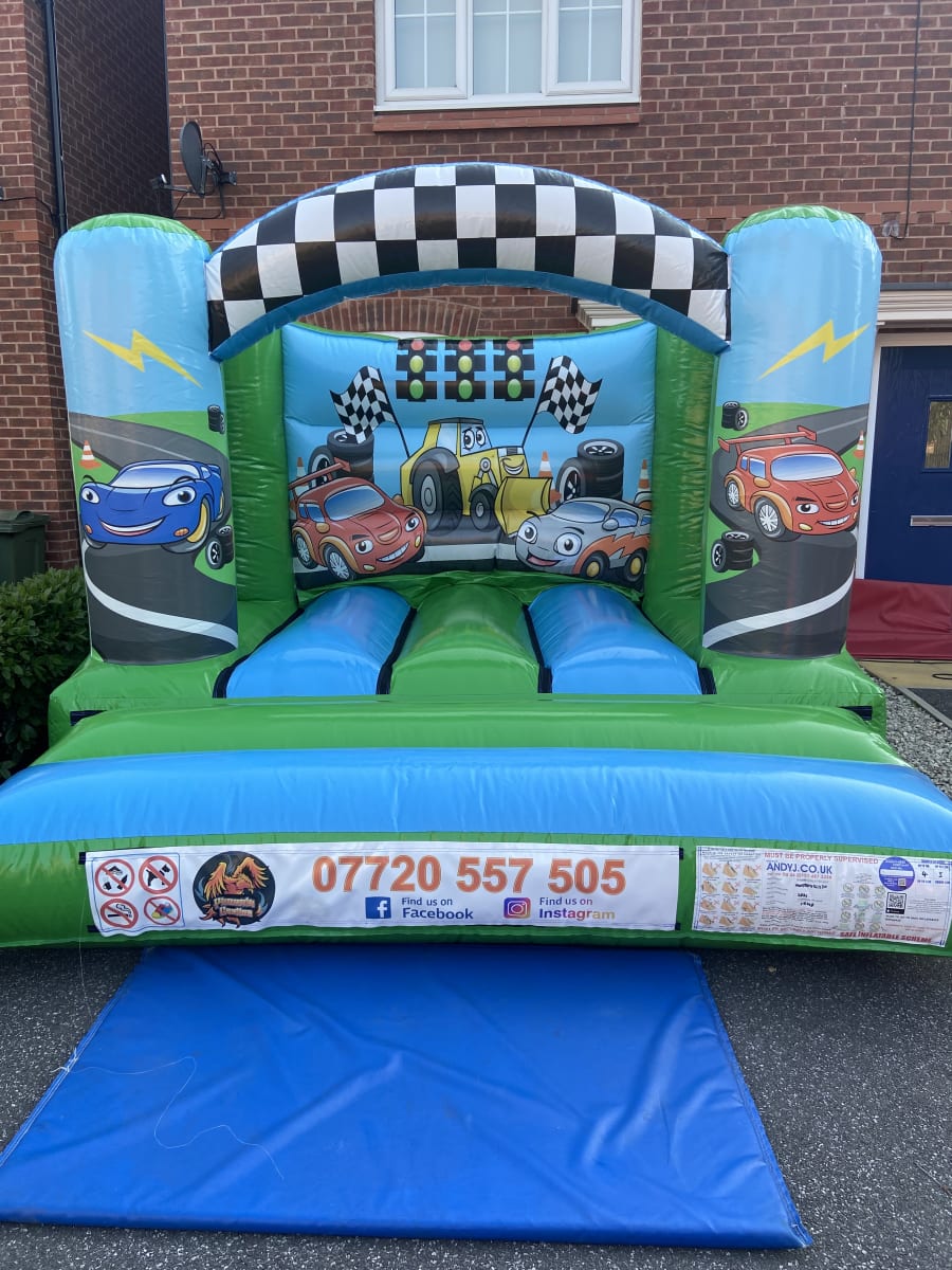 Welcome to Phoenix castles, This is our brand new Racing Cars themed bouncy castle which is 10x1 ft so is perfect if you have a small garden. Brilliant for little boys & girls racing themed birthday parties.